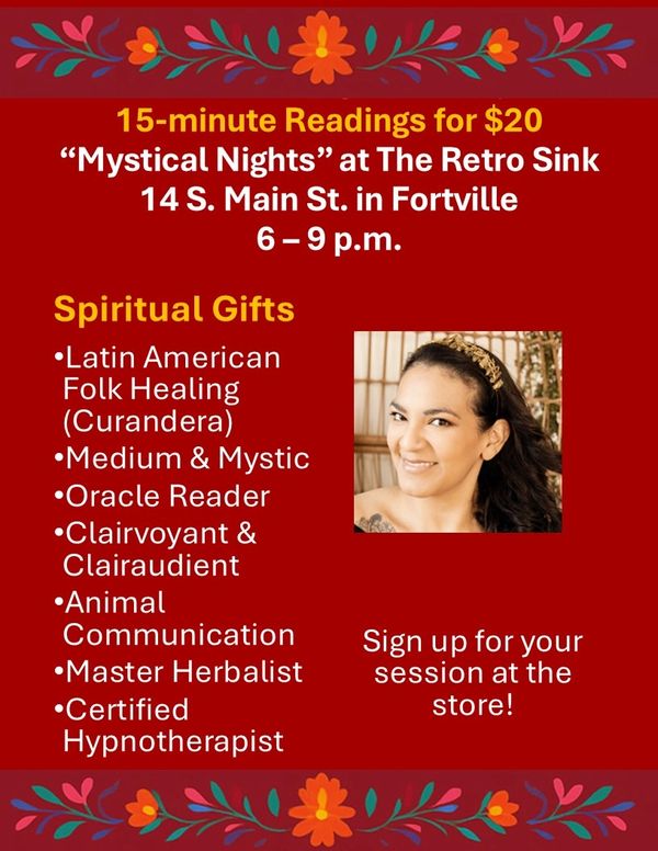 Under the glow of starlight, join me at The Retro Sink in Fortville for an evening of magic, mystery, and spiritual connection. Allow your spirit to be guided through a 15-minute intuitive reading for $20, exploring the realms of oracle wisdom, clairvoyance, and ancient folk healing.